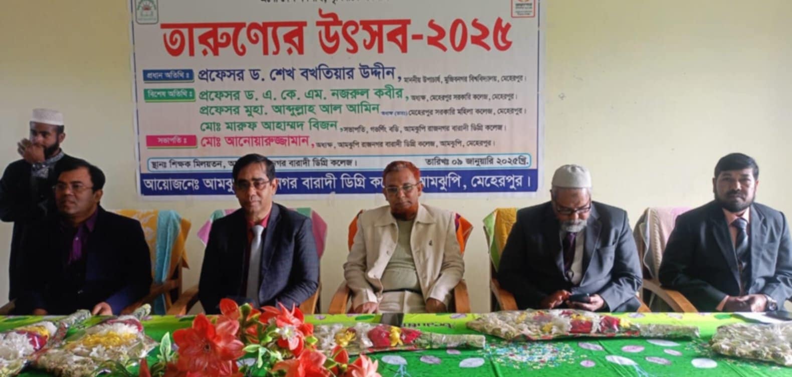 মেহেরপুরে আমঝুপি- রাজনগর -বারাদী ( এআরবি) ডিগ্রী কলেজের অধ্যক্ষ মোঃ আনোয়ারুলজামান মুকুলের সভাপতিত্বে তারুণ্যের উৎসব অনুষ্ঠানে প্রধান অতিথি হিসেবে উপস্থিত ছিলেন মেহেরপুর মুজিবনগর বিশ্ববিদ্যালয়ের উপাচার্য প্রফেসর ড. শেখ বখতিয়ার উদ্দীন।