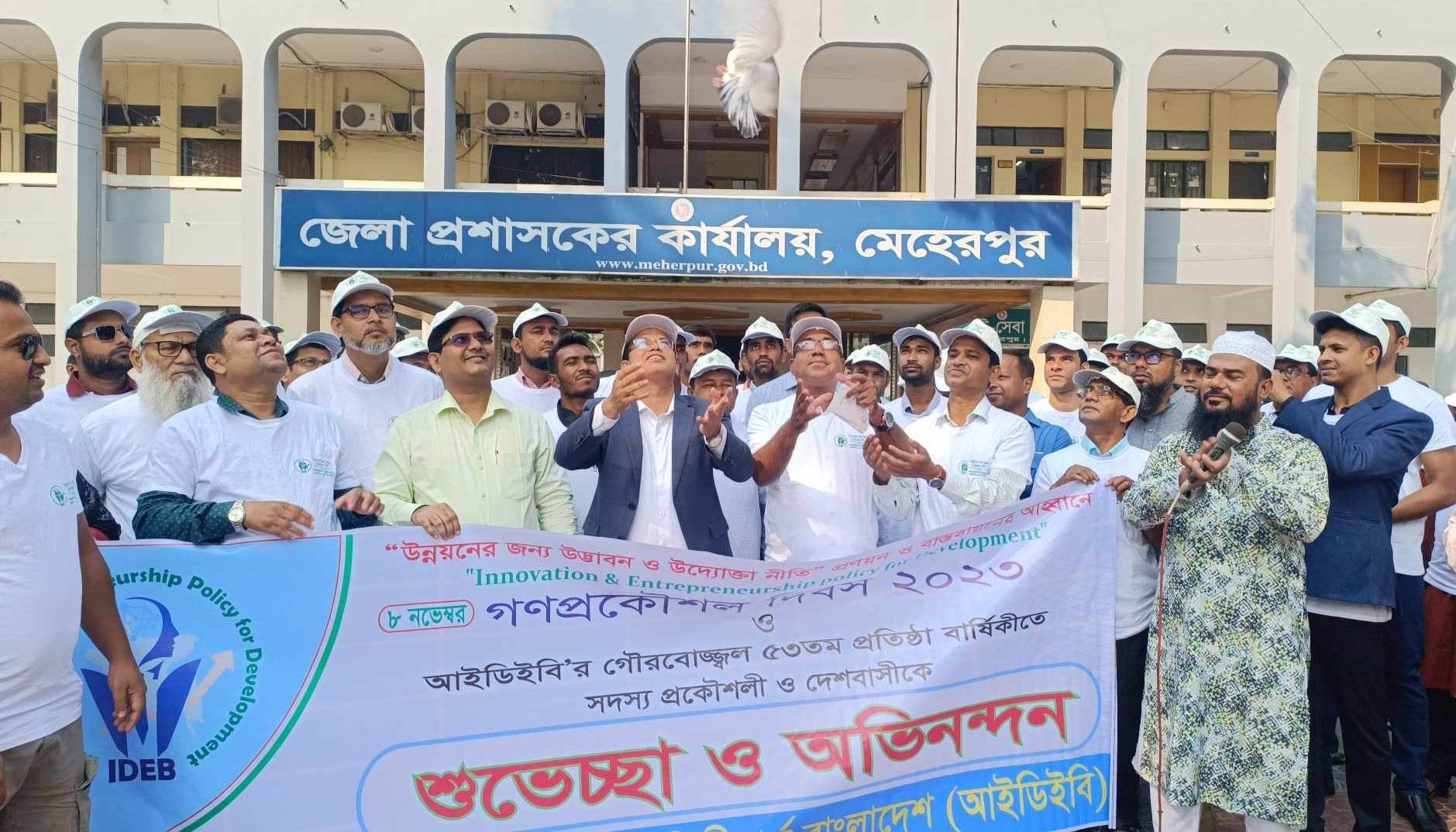 পরে গণপ্রকৌশল দিবস ২০২৩ ও আইডিইবি’র ৫৩ তম প্রতিষ্ঠা বার্ষিকী উপলক্ষে একটি র্যালি বের করা হয়। সড়ক ও জনপদ বিভাগের উপ-বিভাগীয় প্রকৌশলী মিজানুর রহমানের নেতৃত্বে র্যালিটি মেহেরপুর জেলা প্রশাসকের কার্যালয় চত্বর থেকে শুরু করে বাদ্যের তালে তালে শহরের প্রধান প্রধান সড়ক প্রদক্ষিণ শেষে জেলা আইডিইবি’র অফিস প্রাঙ্গনে গিয়ে শেষ হয়।র্যালিতে অন্যদের মধ্যে মেহেরপুর টিটিসি’র অধ্যক্ষ আরিফ হোসেন তালুকদার,আইডিইবি’র সাধারণ সম্পাদক মারুফ আহমেদ,উপ-সহকারী প্রকৌশলী জাহাঙ্গীর হোসেন প্রমুখ উপস্থিত ছিলেন।