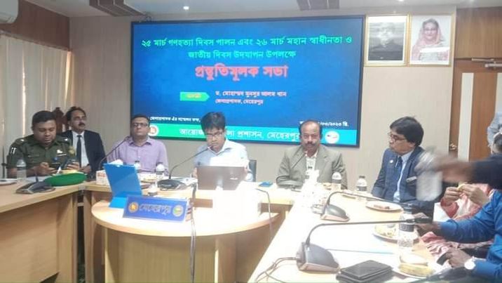 মেহেরপুর জেলা প্রশাসনের উদ্যোগে ২৫ মার্চ গণহত্যা দিবস পালন উপলক্ষে প্রস্তুুতি আলোচনা সভা অনুষ্ঠিত হয়েছে।বৃহস্পতিবার দুপুরের দিকে মেহেরপুর জেলা প্রশাসকের সম্মেলন কক্ষে এ প্রস্তুুতিমূলক সভা অনুষ্ঠিত হয়।
