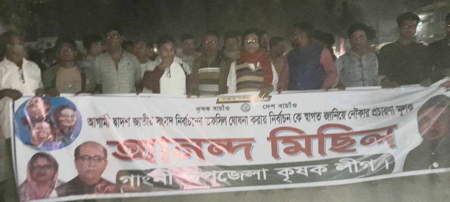 আসন্ন দ্বাদশ জাতীয় সংসদ নির্বাচনের তফসীল ঘোষণা করায় নির্বাচনকে স্বাগত জানিয়ে মেহেরপুরের গাংনীতে কৃষকলীগের উদ্যােগে আনন্দ মিছিল ও সমাবেশ অনুষ্ঠিত হয়েছে। বু