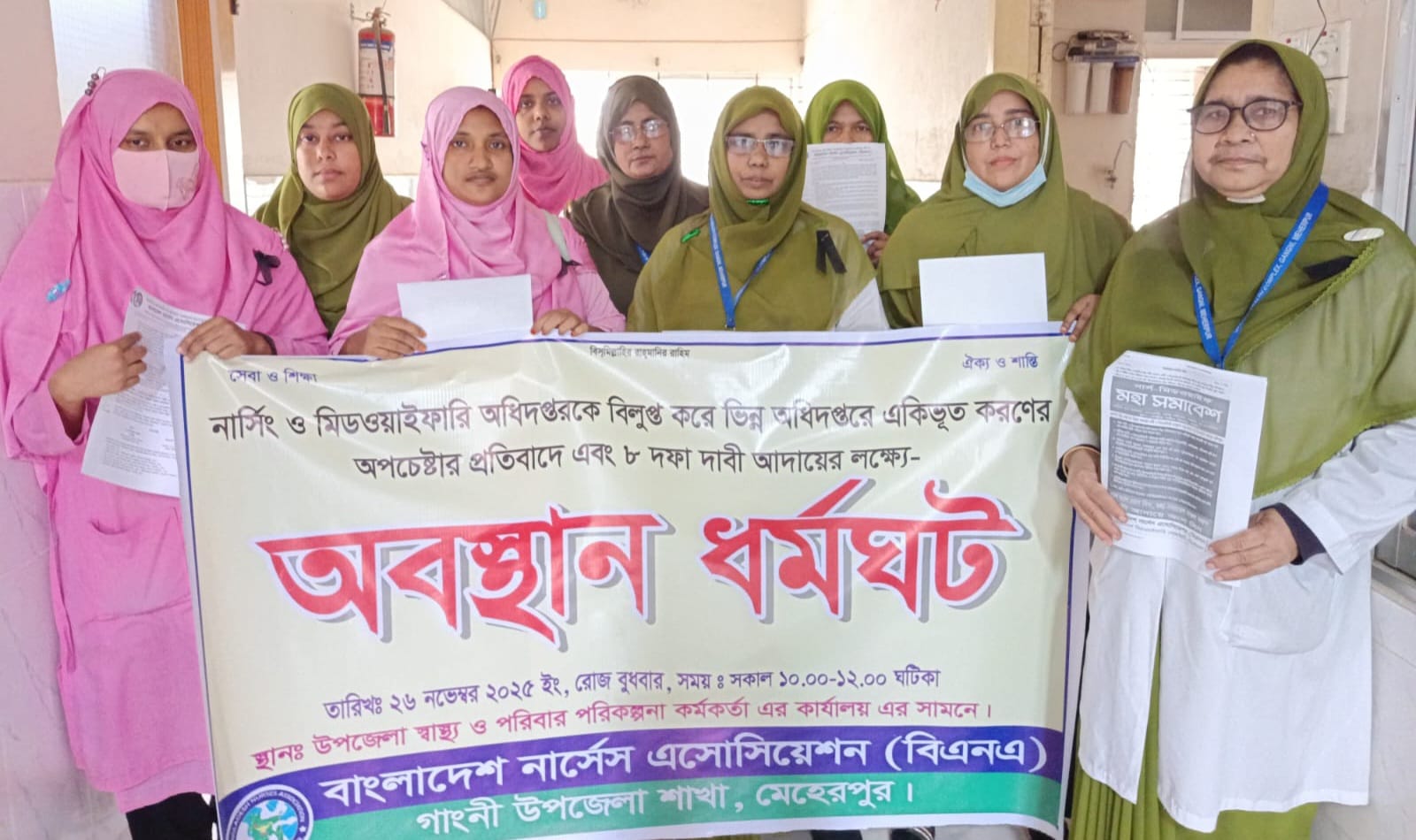 নার্সিং ও মিডওয়াইফারি অধিদপ্তরকে বিলুপ্ত করে ভিন্ন অধিদপ্তরে একিভূত করণের অপচেষ্টার প্রতিবাদে এবং ৮ দফা দাবী আদায়ের লক্ষ্যে মেহেরপুরের গাংনীতে অবস্থান ধর্মঘট ও ২ ঘণ্টা কর্মবিরতি পালন করা হয়েছে।