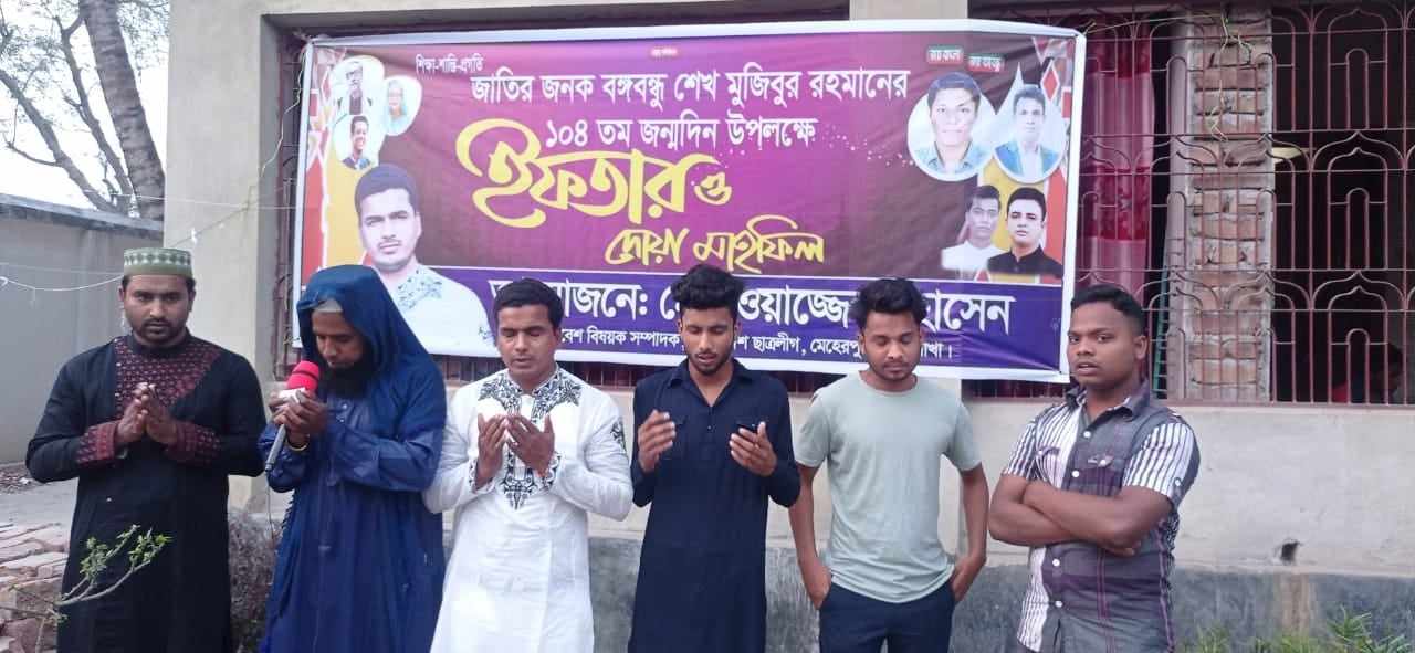 মেহেরপুর জেলা ছাত্রলীগের পরিবেশ বিষয়ক সম্পাদক ওয়াজ্জেল হোসেনের ব্যক্তিগত উদ্যোগে ইফতার ও দোয়া মাহফিল অনুষ্ঠিত হয়।