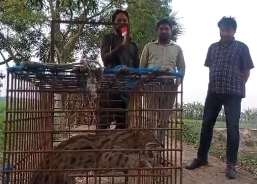 মঙ্গলবার বিকেলের দিকে কসবা গ্রামের বদরুদ্দোজার খামারে আটকা পড়া মেছাে বাঘটি উদ্ধার করে বনবিভাগের একটিদল।