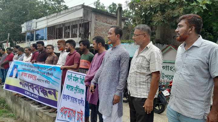 মঙ্গলবার সকালের দিকে গাংনী উপজেলা প্রেস ক্লাবের সামনে মানববন্ধন অনুষ্ঠিত হয়। গাংনীর বিভিন্ন শ্রেণীপেশার মানুষ মানববন্ধনের আয়োজন করে। মানববন্ধন থেকে গাংনী মহিলা ডিগ্রী কলেজের এডহক কমিটির সভাপতি বিএনপি নেতা জাফর আকবর ও কলেজ অধ্যক্ষ খােরশেদ আলীর পদত্যাগের দাবি জানানো হয়।