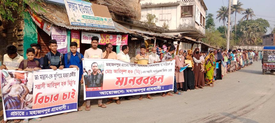 সজনের ডাঁটা পাড়াকে কেন্দ্র করে মেহেরপুরের মুজিবনগর উপজেলার মহাজনপুর গ্রামে আব্দুল মান্নান নামের এক গ্রাম্য চিকিৎসককে কুপিয়ে জখম করায় হামলাকারী আরিফুল হক মিঠুর বিচারের দাবিতে মানববন্ধন ও প্রতিবাদ সভা করেছে মহাজনপুর গ্রামবাসী।