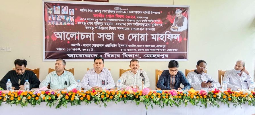 সোমবার সকালে মেহেরপুর জেলা জজ কোট মিলনায়তনে এ আলোচনা সভা অনুষ্ঠিত হয়। মেহেরপুর জেলা ও দায়রা জজ মোঃ ওয়ালিউল ইসলামের সভাপতিত্বে আলোচনা সভায় বক্তব্য রাখেন নারী ও শিশু নির্যাতন দমন ট্রাইব্যুনাল আদালতের বিচারক মোঃ তোহিদুল ইসলাম, অতিরিক্ত জেলা জজ রিপতি কুমার বিশ্বাস, জুডিশিয়াল ম্যাজিস্ট্রেট তরিকুল ইসলাম, পিপি পল্লব ভট্টাচার্য, অ্যাডভোকেট ইব্রাহিম শাহীন, গোলাম মোস্তফা, কাজী শহীদ প্রমূখ। এর আগে জাতীয় শোক দিবস উপলক্ষে জাতির পিতা বঙ্গবন্ধু শেখ মুজিবুর রহমানের প্রতিকৃতিতে পুষ্পমাল্য অর্পণ করা হয় বিচার বিভাগের পক্ষে মেহেরপুর জেলা ও দায়রা জজ মোহাম্মদ ওয়ালিউল ইসলাম পুষ্পমাল্য অর্পণ করেন।
