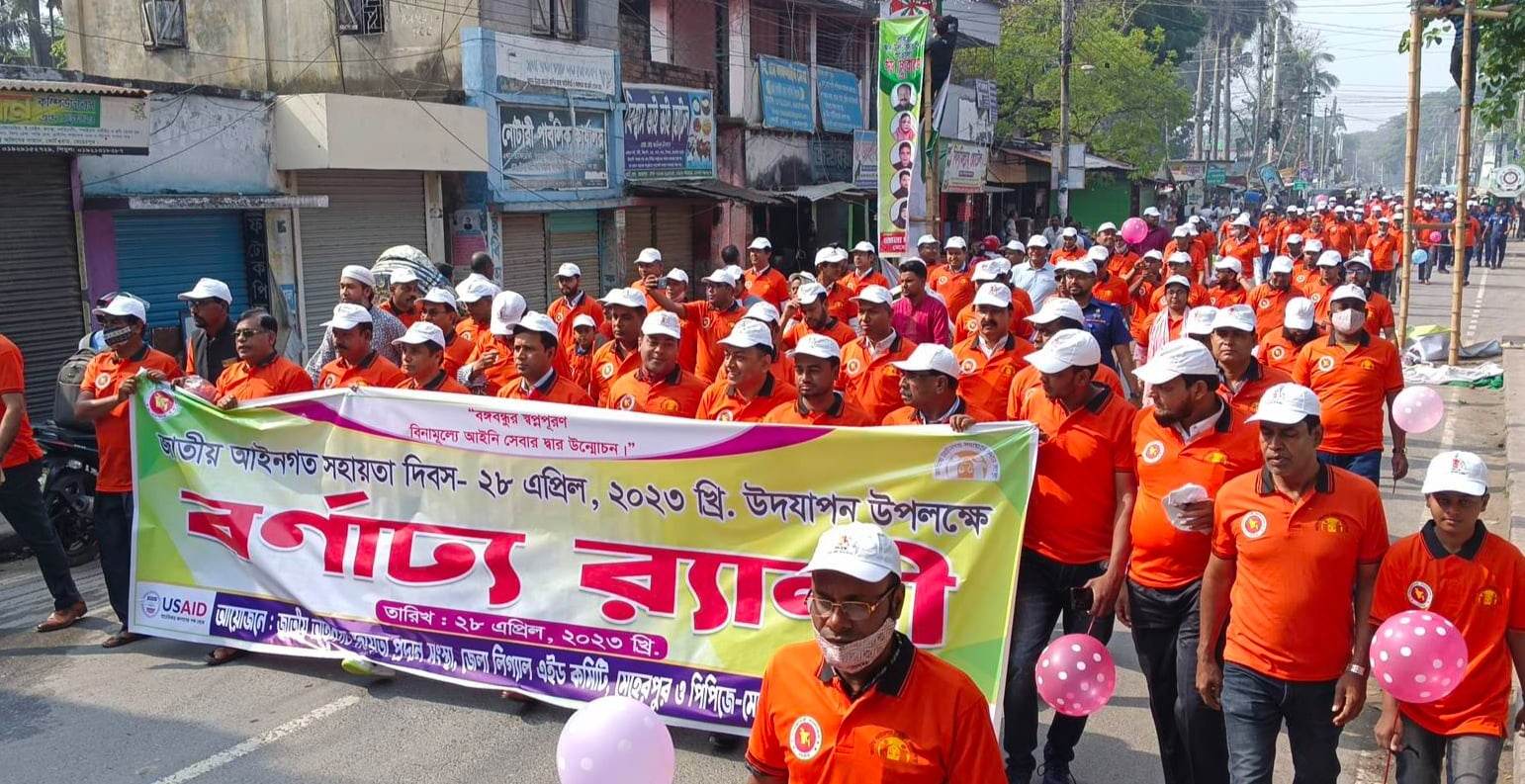 এদিকে এর আগে মেহেরপুরে জাতীয় আইনগত সহায়তা দিবস উপলক্ষে সকালে একটি বর্ণাঢ্য র্যালী বের করা হয়। মেহেরপুর সিনিয়র জেলা ও দায়রা জজ এবং মেহেরপুর জেলা লিগ্যাল এইড কমিটির চেয়ারম্যান মোঃ শহীদুল্লাহ্ এর নেতৃত্বে একটি র্যালি বের করা হয়। মেহেরপুর জেলা জজ কোর্ট প্রাঙ্গণ থেকে শুরু করে বাদ্দের তালে তালে র্যালীটি শহরের প্রধান সড়ক হয়ে মেহেরপুর জেলা শিল্পকলা একাডেমীর সামনে থেকে ঘুরে জেলা জজ কোট প্রাঙ্গনে গিয়ে শেষ হয়।