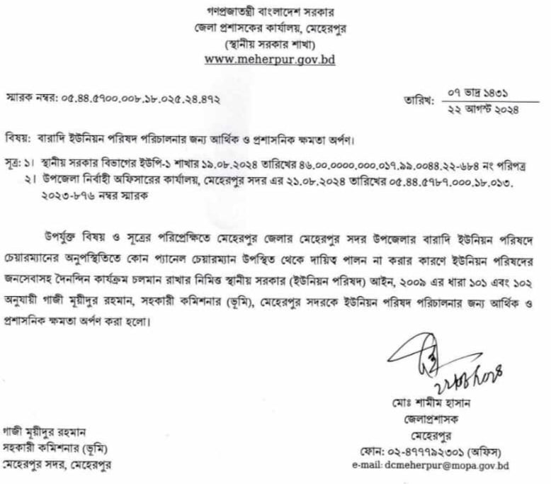 জেলা প্রশাসক শামীম হাসান স্বাক্ষরিত এক পত্র মারফত এ তথ্য নিশ্চিত করা হয়েছে। স্থানীয় সরকার বিভাগ ইউপি-১ শাখা এক পরিপত্র মারফত মেহেরপুর জেলার মেহেরপুর সদর উপজেলার বাড়াদি ইউনিয়ন পরিষদের চেয়ারম্যান মোমিনুল ইসলাম মোমিন এর অনুপস্থিতিতে কোনো প্যানেল চেয়ারম্যান উপস্থিত থেকে দায়িত্ব পালন না করার কারণে ইউনিয়ন পরিষদ জনসেবা সহ দৈনন্দিন কার্যক্রম চলমান রাখার নিমিত্ত স্থানীয় সরকার (ইউনিয়ন পরিষদ) আইন, ২০০৯ এর ধারা ১০১ এবং ১০২ অনুযায়ী মেহেরপুর সদর উপজেলা সহকারী কমিশনার (ভূমি) নির্বাহী ম্যাজিস্ট্রেট গাজী মূয়ীদুর রহমানকে আর্থিক ও প্রশাসনিক ক্ষমতা অর্পন করা হয়।