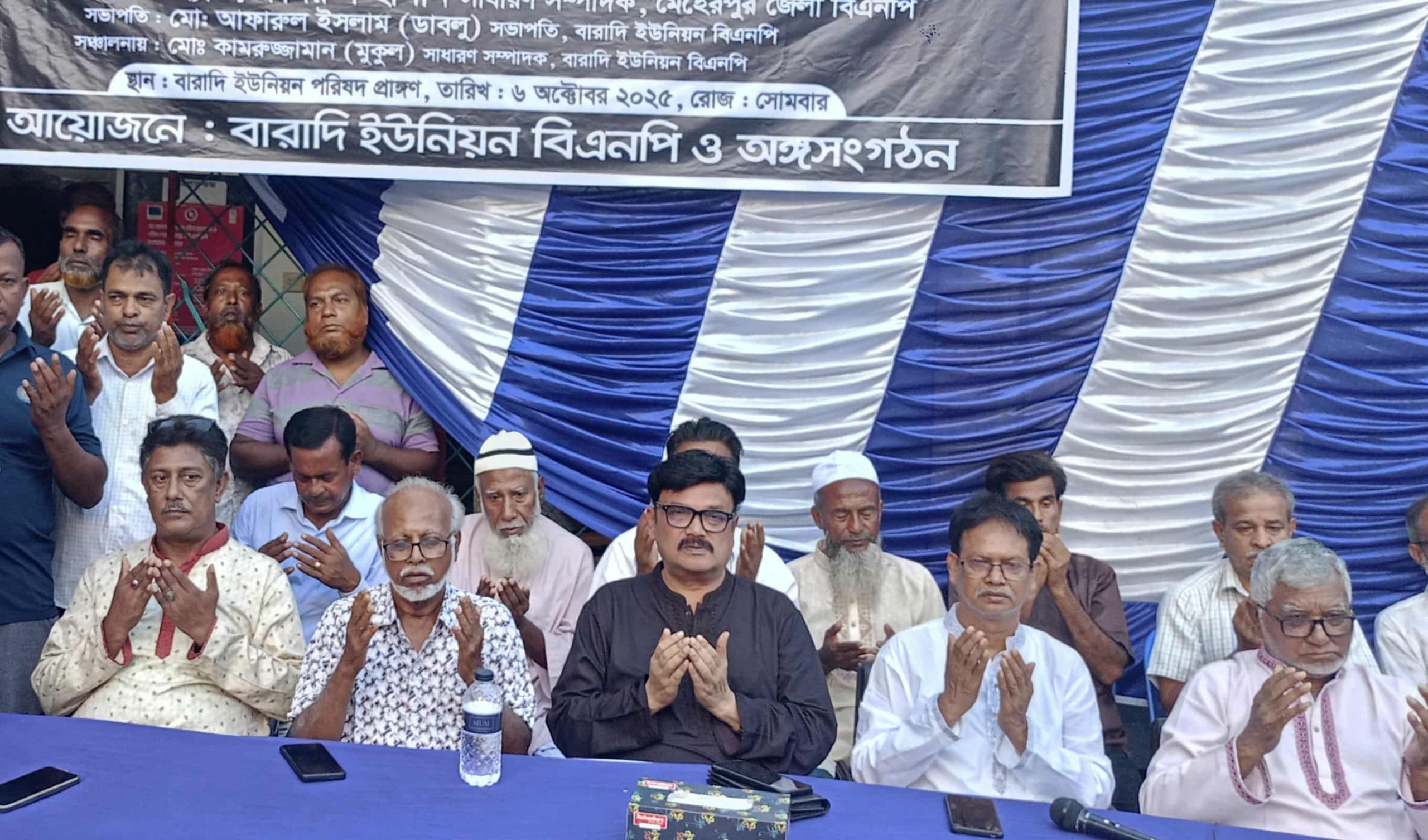 মেহেরপুর সদর উপজেলার বারাদি ইউনিয়ন বিএনপি ও অঙ্গসংগঠনের উদ্যোগে প্রয়াত নেতৃবৃন্দের রুহের মাগফেরাত কামনায় স্মরণসভা, দোয়া মাহফিল ও বিক্ষোভ মিছিল অনুষ্ঠিত হয়েছে।