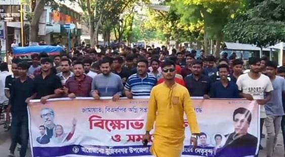 জামায়াত- বিএনপির অগ্নি সন্ত্রাস ও জঙ্গিবাদের বিরুদ্ধে বিক্ষোভ মিছিল ও সমাবেশ করেছে মুজিবনগর উপজেলা ছাত্রলীগ। বুধবার বিকেলে মহাজনপুর ইউনিয়ন ছাত্রলীগের সাবেক সভাপতি ইমাম হোসেন ইমনের নেতৃত্বে মুজিবনগর টেকনিক্যাল স্কুল এন্ড কলেজ থেকে বিক্ষোভ মিছিলটি বের হয়ে কেদারগঞ্জ বাজারের বিভিন্ন সড়ক প্রদক্ষিণ শেষে কেদারগঞ্জ বাজারে সমাবেশ অনুষ্ঠিত হয়।