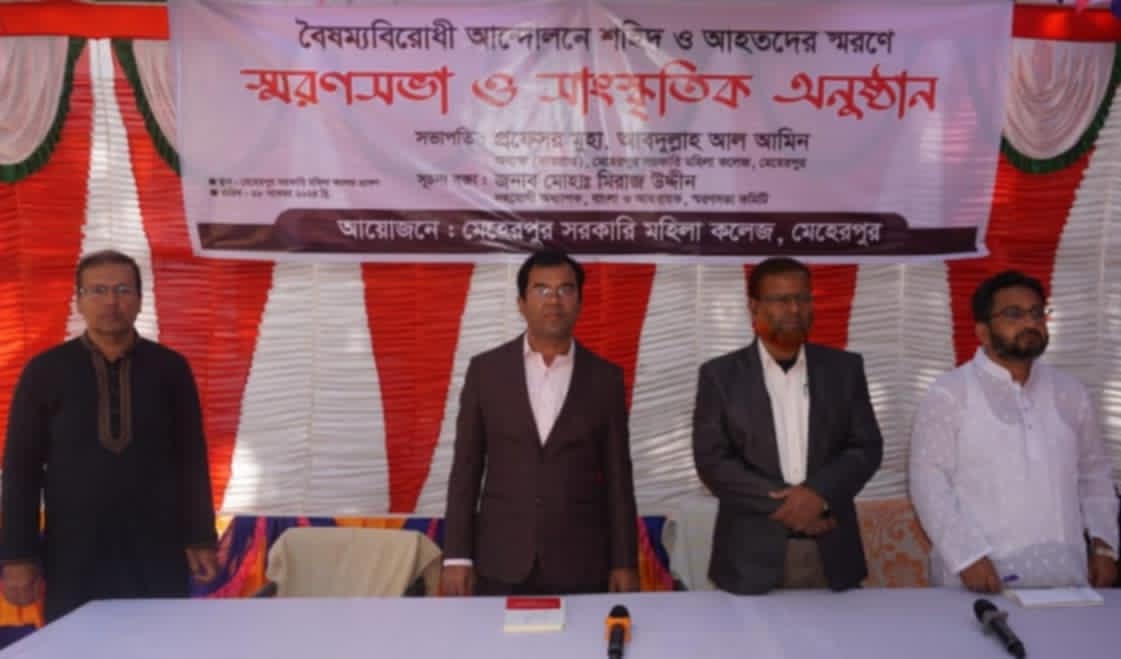 মেহেরপুর সরকারি মহিলা কলেজের অধ্যক্ষ প্রফেসর আবদুল্লাহ আল আমিন এর সভাপতিত্বে অনুষ্ঠিত স্মরণসভায় বক্তব্য রাখেন শিক্ষক পরিষদের সম্পাদক আবদুল হামিদ, সহযোগী অধ্যাপক কাজী আশরাফুল আলম,মিরাজ উদ্দিন, প্রভাষক হুমায়ুন আহমেদ প্রমুখ। সাংস্কৃতিক অনুষ্ঠানে নবারুণ ভট্টাচার্যের কবিতা ‘এই মৃত্যু উপত্যকা আমার দেশ নয়’ থেকে’ পাঠ করেন কাজী আশরাফুল আলম, কাজী নজরুল ইসলাম -এর বিদ্রোহী কবিতা আবৃত্তি করেন তানজিমা তাসমিম হক মোহনা, সংগীত পরিবেশন করেন অনিন্দিতা সরকার, মানসী হক বাঁধন, পৌলমী কুণ্ডু।
