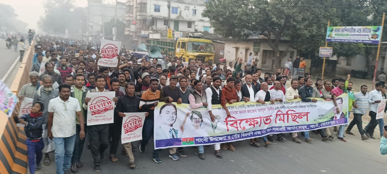 সােমবার বিকেলে গাংনী বাজারে একটি বিক্ষোভ মিছিল শুরু করে শহরের প্রধান প্রধান সড়ক প্রদক্ষিণ করে। পরে উপজেলা বিএনপির কার্যালয চত্বরে সমাবেশ অনুষ্ঠিত হয়।