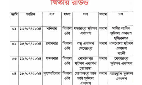 শনিবার প্রথম কোয়ার্টার ফাইনালে মুজিবনগর উপজেলার ভবের পাড়া মাহির-লাবিব একাদশ এবং যতারপুর একাদশ একে অপরের বিরুদ্ধে লড়বে। প্রথম রাউন্ডে খেলায় ভবেরপাড়া মাহির-লাবিব একাদশ ১১-০ গোলে শিবপুর একাদশকে এবং যথারাপুর একাদশ ৩-১ গোলে দর্শনা ফুটবল একাদশকে পরাজিত করে কোয়ার্টার ফাইনালে খেলার যোগ্যতা অর্জন করে।