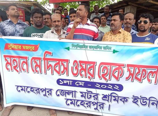 মেহেরপুর জেলা মোটর শ্রমিক ইউনিয়নের সভাপতি আহসান হাবিব সোনার সভাপতিত্বে মেহেরপুর পুরাতন বাসষ্ট্যান্ড এলাকায় অনুষ্ঠিত আলোচনা সভায় বক্তব্য রাখেন সাধারণ সম্পাদক মতিউর রহমান, যুগ্ম সম্পাদক বকুল হোসেন, রেজাউল হক প্রমূখ। এদিকে এর আগে মহান মে দিবস উপলক্ষে একটি র্যালী বের করা হয়। মেহেরপুর জেলা মোটর শ্রমিক ইউনিয়নের সভাপতি আহসান হাবিব সোনার নেতৃত্বে র্যালীটি মেহেরপুর শহরের পুরাতন বাসস্ট্যান্ড এলাকা প্রদক্ষিণ করে।