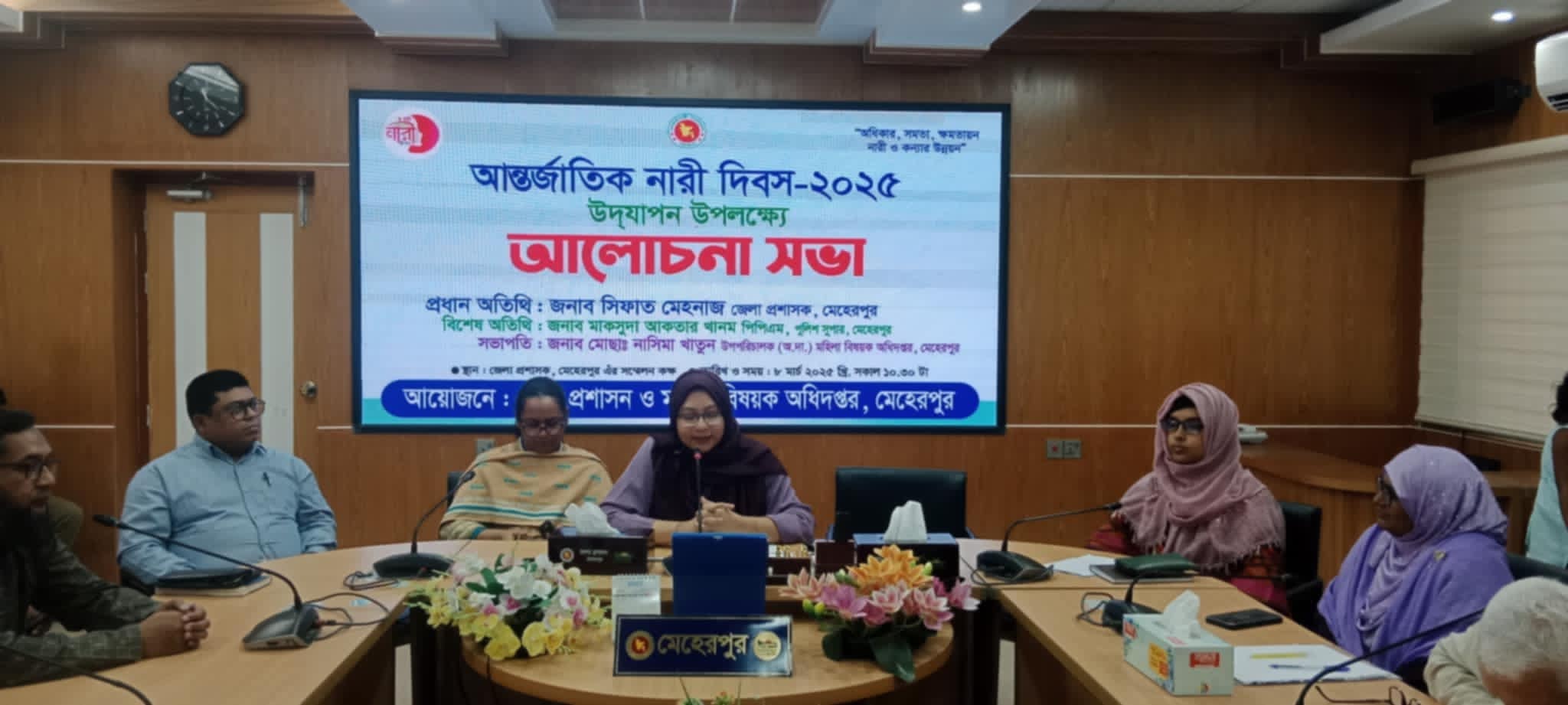 মেহেরপুর জেলা মহিলা বিষয়ক অধিদপ্তরের উপ-পরিচালক নাসিমা খাতুনের সভাপতিত্বে আলোচনা সভায় প্রধান অতিথি হিসেবে উপস্থিত ছিলেন জেলা প্রশাসক সিফাত মেহনাজ।