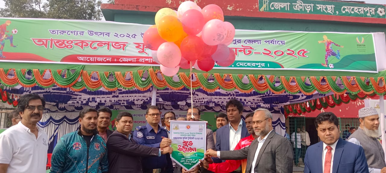 মেহেরপুর জেলা প্রশাসন ও জেলা ক্রীড়া অফিসের উদ্যোগে জেলা পর্যায়ে আন্ত কলেজ গোল্ডকাপ ফুটবল টুর্নামেন্টের বর্ণাঢ্য উদ্বোধন অনুষ্ঠিত হয়েছে। মঙ্গলবার সকালে মেহেরপুর স্টেডিয়াম মাঠে আনুষ্ঠানিকভাবে টুর্নামেন্টের উদ্বোধন ঘোষণা করা হয়।