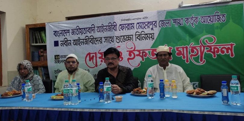 বাংলাদেশ জাতীয়তাবাদী আইনজীবী ফোরাম মেহেরপুর জেলা শাখার সভাপতি মারুফ আহমেদ বিজন এর সভাপতিত্বে ইফতার মাহফিলে অন্যদের মধ্যে মেহেরপুর জেলা আইনজীবী সমিতির সভাপতি কামরুল হাসান, সাবেক সভাপতি আনোয়ার হোসেন, সহ-সভাপতি আদিল করিম, আফরোজা বেগম ফাতেমা প্রমুখ উপস্থিত ছিলেন।