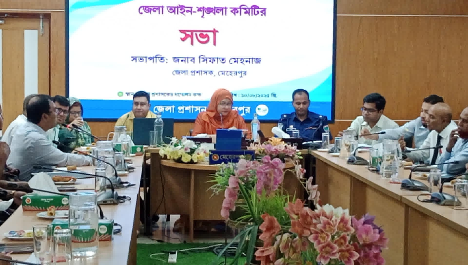 মেহেরপুর জেলা প্রশাসনের উদ্যোগে জেলা আইন শৃঙ্খলা কমিটির মাসিক সভা অনুষ্ঠিত হয়েছে। রবিবার সকালে জেলা প্রশাসকের সম্মেলন কক্ষে সভায় সভাপতিত্ব করেন জেলা প্রশাসক সিফাত মেহনাজ।