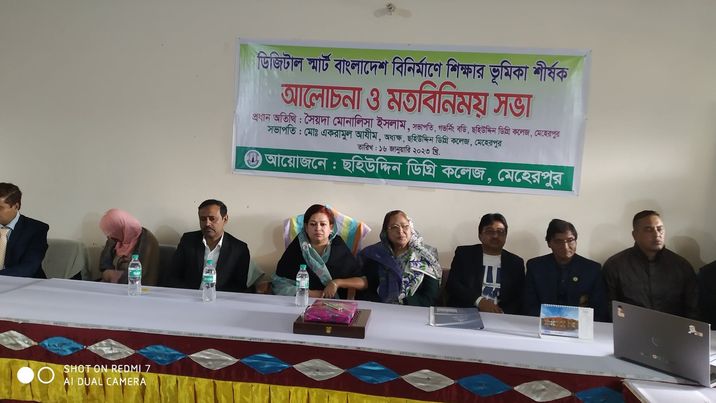 মেহেরপুর ছহিউদ্দিন ডিগ্রী কলেজের উদ্যোগে ডিজিটাল স্মার্ট বাংলাদেশ বিনির্মাণে শিক্ষার ভূমিকা শীর্ষক আলোচনা সভা অনুষ্ঠিত হয়েছে।সোমবার দুপুরের দিকে ছহিউদ্দীন ডিগ্রী কলেজ মিলনায়তনে এ আলোচনা সভা অনুষ্ঠিত।
