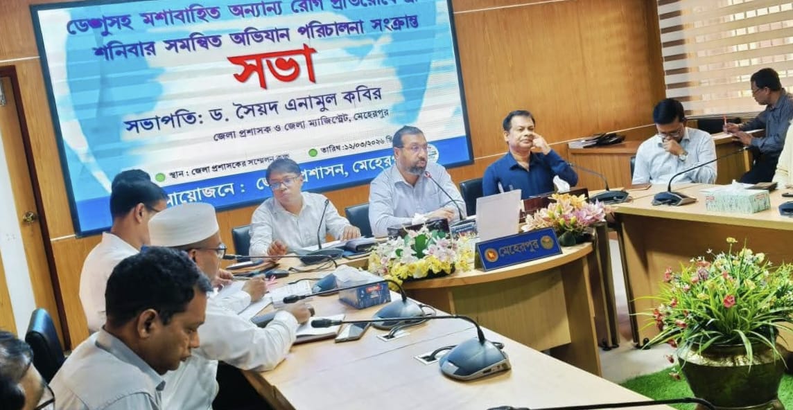 মেহেরপুর জেলা প্রশাসনের উদ্যোগে “ডেঙ্গুসহ মশাবাহিত অন্যান্য রোগ প্রতিরোধে প্রতি শনিবার সমন্বিত অভিযান পরিচালনা” শীর্ষক এক গুরুত্বপূর্ণ সভা অনুষ্ঠিত হয়েছে।