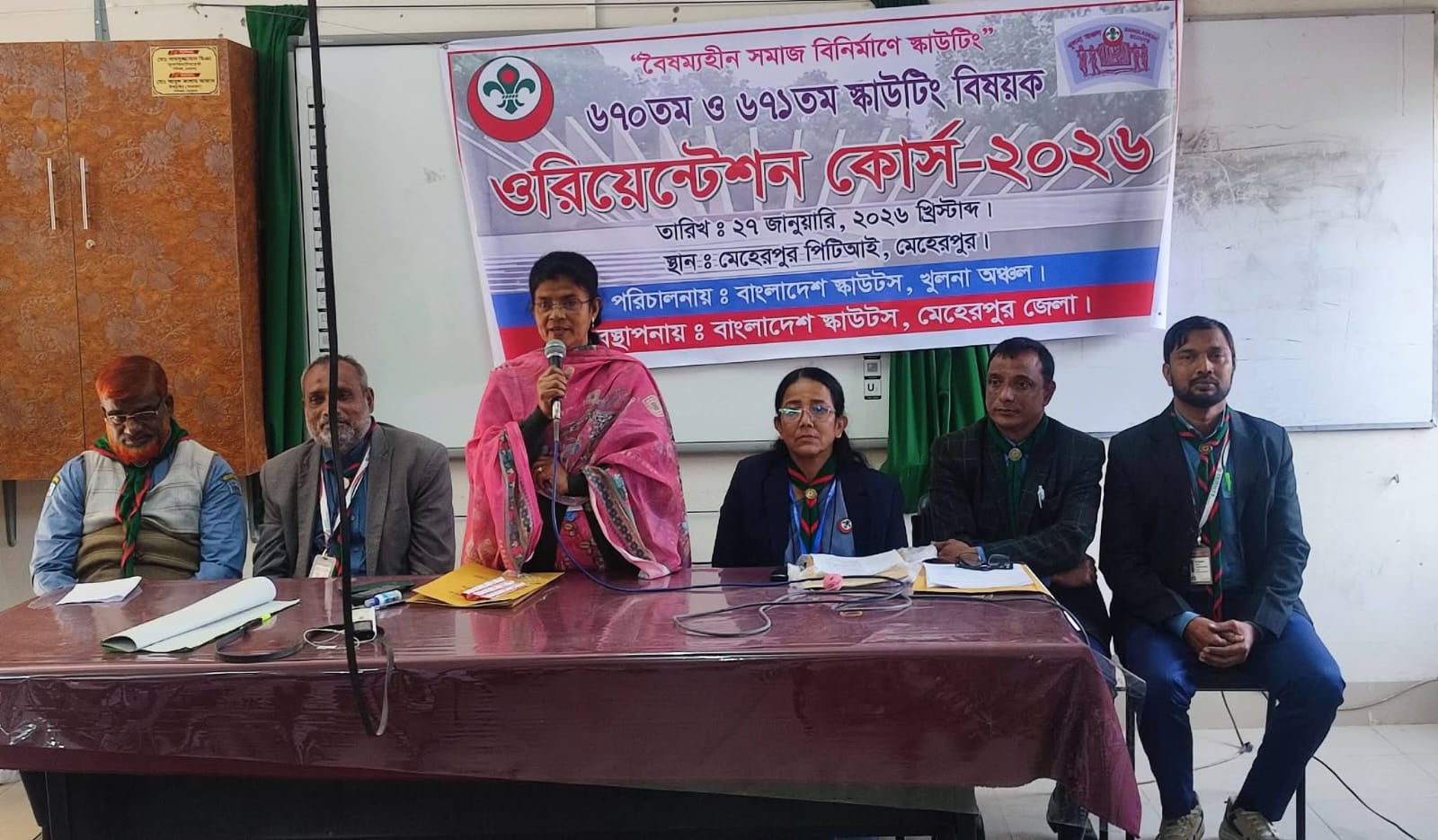 বাংলাদেশ স্কাউটস খুলনা অঞ্চলের উদ্যোগে দিনব্যাপী ৬৭০তম ও ৬৭১তম স্কাউটিং বিষয়ক ওরিয়েন্টেশন কোর্স অনুষ্ঠিত হয়েছে। মঙ্গলবার সকালে মেহেরপুর পিটিআই মিলনায়তনে এ দিনব্যাপী কোর্সের আয়োজন করা হয়।