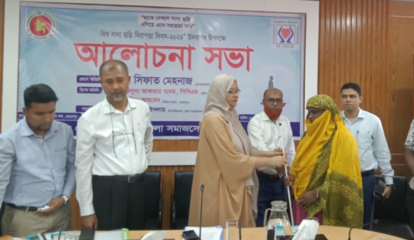 জেলা সমাজসেবা অধিদপ্তরের উপ-পরিচালক মোঃ আসাদুল ইসলামের সভাপতিত্বে আলোচনা সভায় প্রধান অতিথি হিসাবে উপস্থিত ছিলেন জেলা প্রশাসক সিফাত মেহনাজ।এতে বিশেষ অতিথি হিসাবে উপস্থিত ছিলেন সিভিল সার্জন ডাঃ মহী উদ্দিন আহমেদ,অতিরিক্ত জেলা প্রশাসক (সার্বিক) মুঃ তানভীর হাসান রুমান “হাতে দেখলে সাদা ছড়ি এগিয়ে এসো সহয়তা করি” এর প্রতিপাদ্যের উপর বক্তব্য রাখেন মেহেরপুর জেলা প্রতিবন্ধী বিষয়ক কর্মকর্তা তুলসী কুমার পাল,মেহেরপুর জেলা সমাজ সেবা অধিদপ্তরের রেজিস্ট্রেশন কর্মকর্তা কাজী মুনসুর আলী।