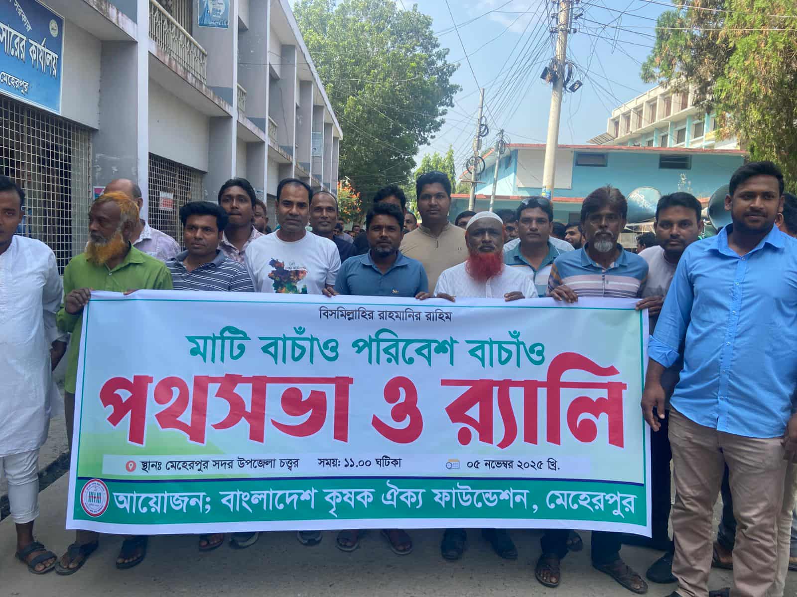 “মাটি বাঁচাও, পরিবেশ বাঁচাও” — এই প্রতিপাদ্যকে সামনে রেখে বাংলাদেশ কৃষক ঐক্য ফাউন্ডেশনের উদ্যোগে মেহেরপুর সদর উপজেলা চত্বরে পথসভা ও র্যালি অনুষ্ঠিত হয়েছে।