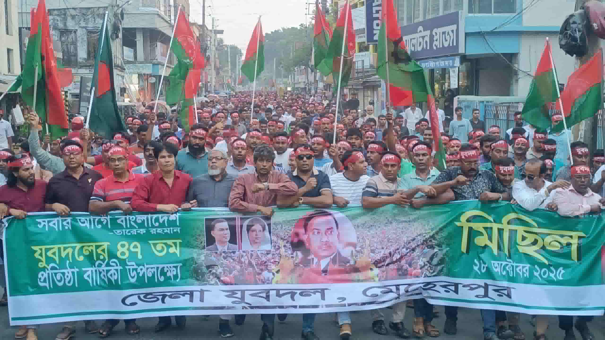 বাংলাদেশ জাতীয়তাবাদী যুবদলের ৪৭তম প্রতিষ্ঠাবার্ষিকী উপলক্ষে মেহেরপুর জেলা যুবদলের উদ্যোগে আনন্দ মিছিল ও সমাবেশ অনুষ্ঠিত হয়েছে।