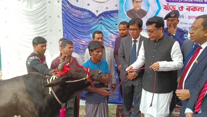 রবিবার দুপুরের দিকে মেহেরপুর জেলা শিল্পকলা একাডেমি মিলনায়তনেন দুগ্ধ ও মাংস উৎপাদনের মাধ্যমে গ্রামীণ কর্মসংস্থান সৃষ্টির লক্ষে ২৫০ জনের মধ্যে ২ কোটি ৬২ লাখ ৫০ হাজার টাকার চেক ও ৮ জনের মাঝে ষাঁড় ও গাভি বিতরন করা হয়। জেলা প্রশাসক ড. মোহাম্মদ মুনছুর আলম খানের সভাপতিত্বে মেহেরপুর জেলা প্রশাসনের সহযোগিতায়, সমবায় খুলনা প্রকল্প পরিচালকপর দপ্তরের উদ্যোগে চেক বিতরণ অনুষ্ঠানের প্রধান অতিথি হিসেবে উপস্থিত ছিলেন জনপ্রশাসন প্রতিমন্ত্রী ফরহাদ হোসেন।