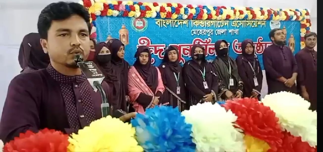 বাংলাদেশ কিন্ডারগার্টেন অ্যাসোসিয়েশন মেহেরপুর জেলা শাখার সভাপতি সিরাজুল ইসলামের সভাপতিত্বে বাংলাদেশ কিন্ডারগার্টেন অ্যাসোসিয়েশন মেহেরপুর জেলা শাখার সাধারণ সম্পাদক মো আফতাব আলী খানের সঞ্চালনায় অনুষ্টানে স্বাগত বক্তব্য রাখেন বাংলাদেশ কিন্ডারগার্টেন অ্যাসোসিয়েশন মেহেরপুর জেলা শাখার ঈদ পুনর্মিলনী অনুষ্ঠান পরিচালনা কমিটির আহবায়ক ফায়েল উদ্দিন আহমেদ। পরে সেখানে সাংস্কৃতিক অনুষ্ঠান, কুইজ প্রতিযোগিতা এবং বিজেয়ীদের মাঝে পুরস্কার বিতরণ করা হয়।