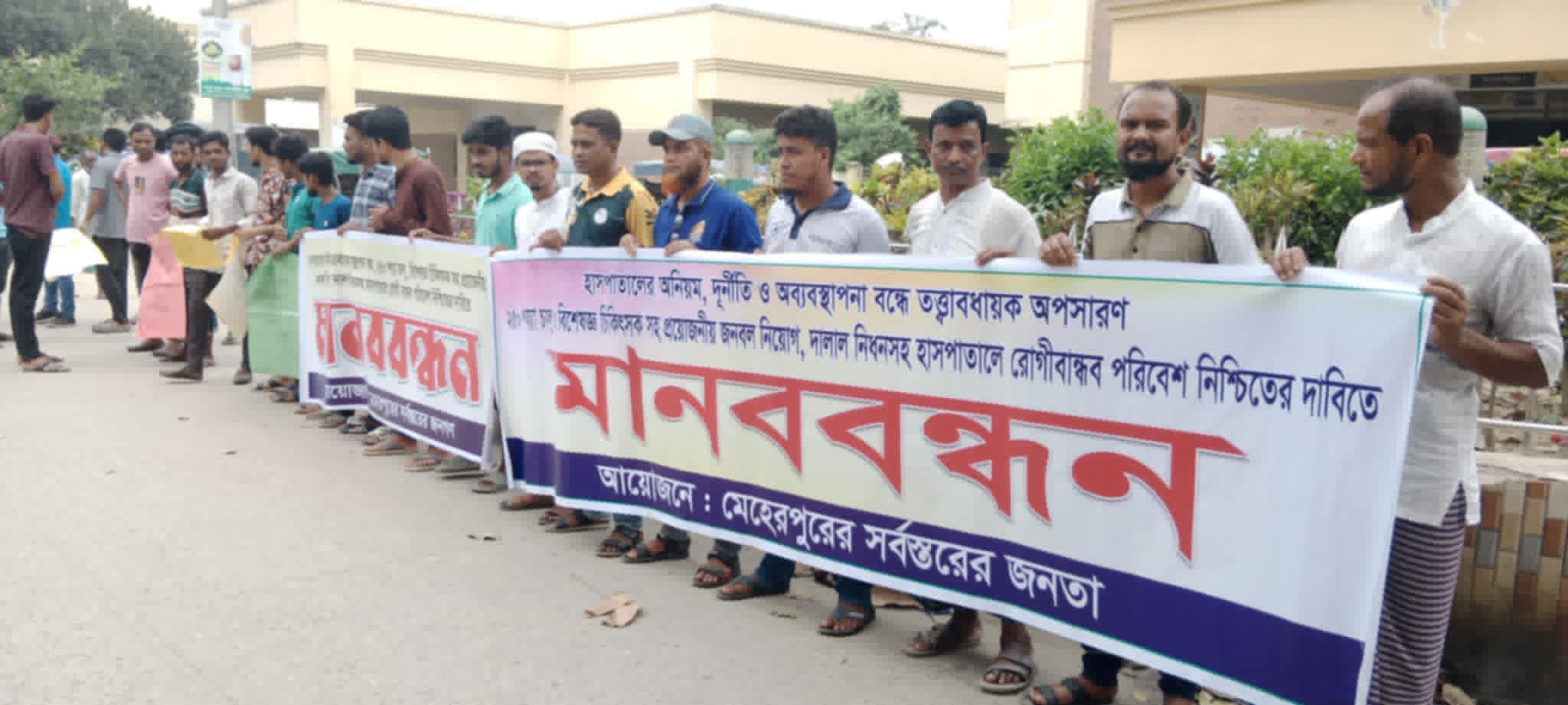 হাসপাতালের অনিয়ম, দুর্নীতি ও অব্যবস্থাপনা বন্ধে তত্ত্বাবধায়ক অপসারণ, মেহেরপুর ২৫০ শয্যা বিশিষ্ট জেনারেল চালুসহ প্রয়োজনীয় জনবল নিয়োগ, দালাল নিধন সহ হাসপাতালে রোগীবান্ধব পরিবেশ নিশ্চিতের দাবিতে মানববন্ধন অনুষ্ঠিত হয়েছে।
