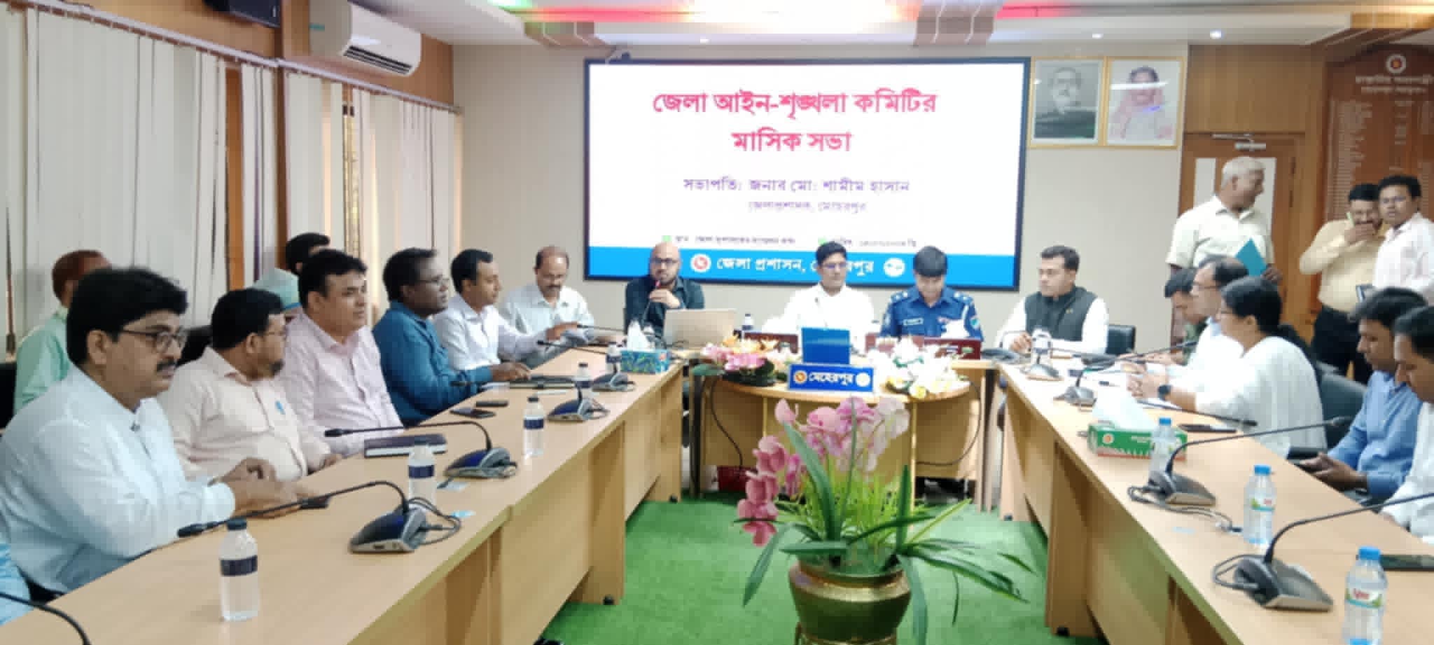 স্থানীয় সরকার বিভাগের উপ-পরিচালক মোঃ শামীম হোসেনের সভাপতিত্বে জেলা আইন শৃঙ্খলা কমিটির সভায় বক্তব্য রাখেন পুলিশ সুপার এস এম নাজমুল হক,অতিরিক্ত জেলা প্রশাসক শামীম ভূঁইয়া,পৌরসভার মেয়র মাহফুজুর রহমান রিটন, মেহেরপুর সরকারি মহিলা কলেজের ভারপ্রাপ্ত অধ্যক্ষ আন্দুল্লাহ আল আমীন, জেলা কমান্ড্যান্ট প্রদীপ চ্দ্র দত্ত, ডা.অলোক কুমার দাস, মেহেরপুর সদর উপজেলা পরিষদের চেয়ারম্যান আনারুল ইসলাম, গাংনী উপজেলা নির্বাহী কর্মকর্তা প্রতীম কুমার সাহা, মুজিবনগর উপজেলা সহকারি কমিশনার (ভূমি) ও নির্বাহী ম্যাজিস্ট্রেট সাদাত আহমেদ রত্ন, জেলা সমাজসেবা অধিদপ্তরের উপ-পরিচালক কাজী কাদের মোঃ ফজলে রাব্বি।