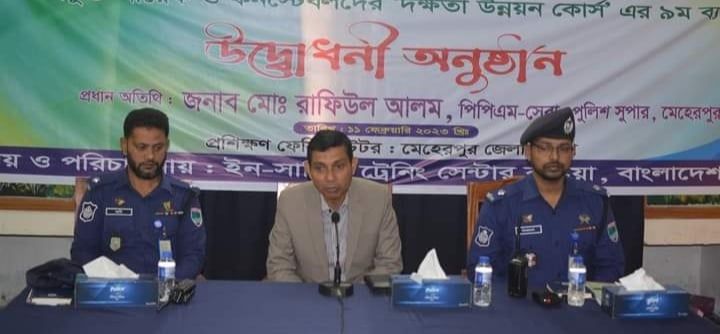 মেহেরপুরের পুলিশ সুপার মোঃ রাফিউল আলম (পিপিএম-সেবা) দক্ষতা উন্নয়ন কোর্সের উদ্বোধন করেন। উদ্বোধনী অনুষ্ঠানে অন্যদের মধ্যে অতিরিক্ত পুলিশ সুপার (প্রশাসন) জামিরুল ইসলাম, অতিরিক্ত পুলিশ সুপার (সদর সার্কেল) আজমল হোসেন প্রমুখ উপস্থিত ছিলেন। প্রশিক্ষণে বাংলাদেশ পুলিশের নায়েক, কনস্টেবলদের এক সপ্তাহ মেয়াদী দক্ষতা উন্নয়ন কোর্সের ৯ম ব্যাচে ৩৫ জন অংশগ্রহণ করছে।
