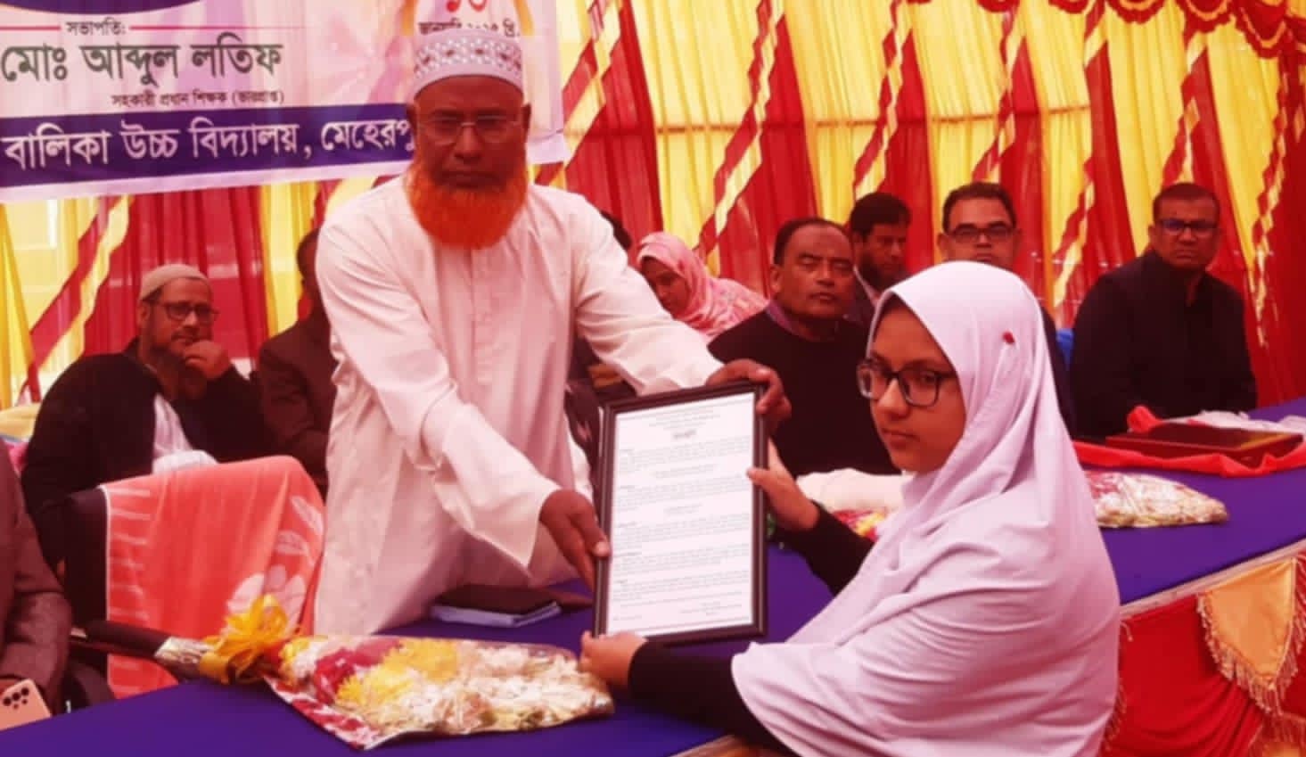 মেহেরপুর সরকারি বালিকা উচ্চ বিদ্যালয়ে বিভিন্ন প্রতিযোগিতার বিজয়ীদের মাঝে পুরস্কার বিতরণ করা হয়েছে। বৃহস্পতিবার সকালের দিকে সরকারি বালিকা উচ্চ বিদ্যালয় প্রাঙনে পুরস্কার বিতরণ করা হয়। সরকারি বালিকা উচ্চ বিদ্যালয় ভারপ্রাপ্ত প্রধান শিক্ষক ফজলুল হক বিজয়ীদের হাতে পুরস্কার তুলে দেন এ সময় সিনিয়র শিক্ষক আব্দুল লতিফ, সেকেন্দার আলী, আব্দুল মান্নান, সিরাজ উদ্দিন উপস্থিত ছিলেন।