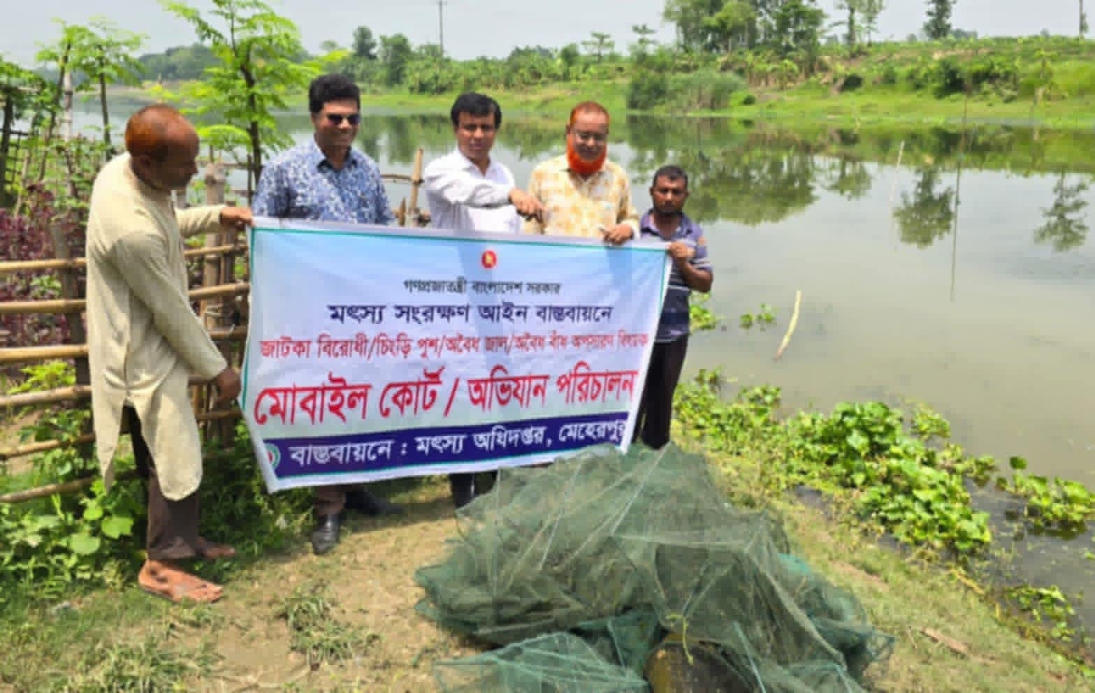মেহেরপুর সদর উপজেলা নির্বাহী অফিসার খায়রুল ইসলামের নেতৃত্বে মোবাইল কোর্টে ভৈরব নদে পেতে রাখা বিপুল পরিমাণ চায়না দুয়ারী জাল উদ্ধার করেন। পরে সেগুলো আগুন দিয়ে পুড়িয়ে বিনষ্ট করা হয়। মেহেরপুর জেলা মৎস্য অফিসার সাধন চন্দ্র সরকার, সদর উপজেলা সিনিয়র মৎস্য কর্মকর্তা কামরুন্নাহার আখি, মীর জাকির হোসেন প্রমুখ এ সেখানে উপস্থিত ছিলেন।