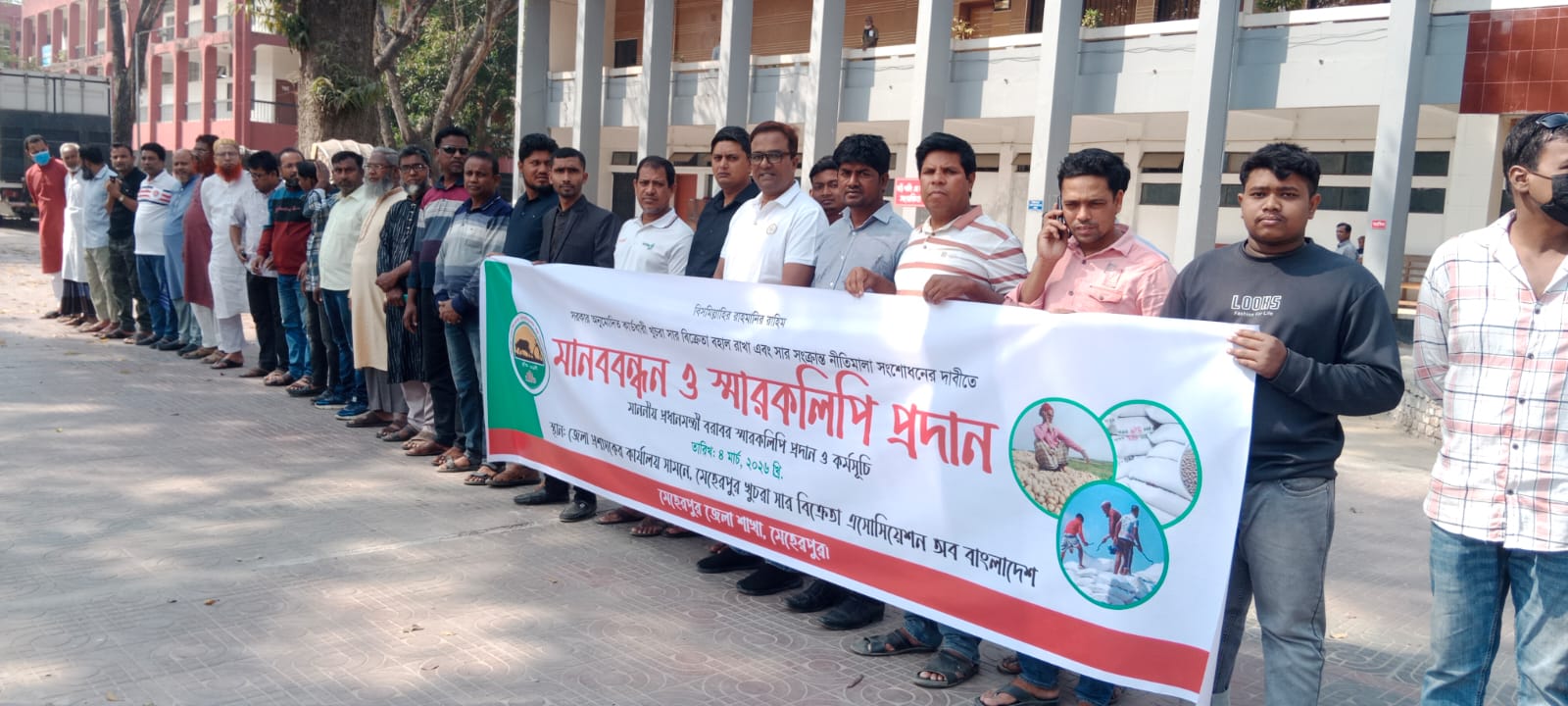 দেশব্যাপী বাংলাদেশ সরকার অনুমোদিত কার্ডধারী খুচরা সার বিক্রেতাদের সনদ স্থগিত করার প্রতিবাদে মেহেরপুরে মানববন্ধন কর্মসূচি ও স্মারকলিপি প্রদান করা হয়েছে। মেহেরপুর জেলা খুচরা সার বিক্রেতা অ্যাসোসিয়েশন অব বাংলাদেশ, মেহেরপুর জেলা শাখার উদ্যোগে বুধবার সকালে জেলা প্রশাসকের কার্যালয় চত্বরে এ মানববন্ধন অনুষ্ঠিত হয়।
