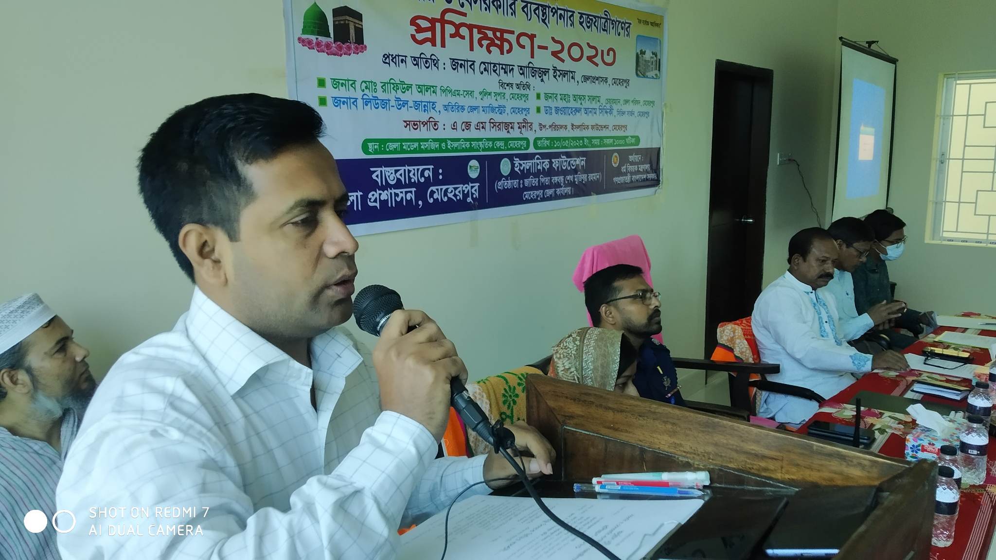 বুধবার সকালে মেহেরপুর জেলা মডেল মসজিদ ও ইসলামিক সাংস্কৃতিক কেন্দ্র মিলনায়তনে হজ্ব যাত্রীগণের প্রশিক্ষণ অনুষ্ঠিত হয়। জেলা প্রশাসক মোহাম্মদ আজিজুল ইসলাম দিনব্যাপী প্রশিক্ষনের উদ্বোধন ঘোষণা করেন। মেহেরপুর জেলা ইসলামিক ফাউন্ডেশনের উপ-পরিচালক এ জে এম সিরাজুম মুনির এর সভাপতিত্বে প্রশিক্ষণের উদ্বোধনী অনুষ্ঠানে বিশেষ অতিথি হিসেবে উপস্থিত ছিলেন মেহেরপুর জেলা পরিষদের চেয়ারম্যান অ্যাডভোকেট আব্দুস সালাম,সিভিল সার্জন ডাঃ জওয়াহেরুল আনাম সিদ্দিকী,অতিরিক্ত জেলা ম্যাজিস্টেট লিউজা – উল জান্নাহ, অতিরিক্ত পুলিশ সুপার আজমল হোসেন। স্বাগত বক্তব্য রাখেন মেহেরপুর জেলা ইসলামিক ফাউন্ডেশনের উপ-পরিচালক এ জে এম সিরাজুম মুনির।এবার মেহেরপুর জেলা থেকে মোট ১২৭ পবিত্র হজ্ব পালন করবেন। মধ্যে সরকারি ব্যবস্থাপনায় ৯ জন এবং বেসরকারি ব্যবস্থাপনায় ১১৮ জন রয়েছেন।