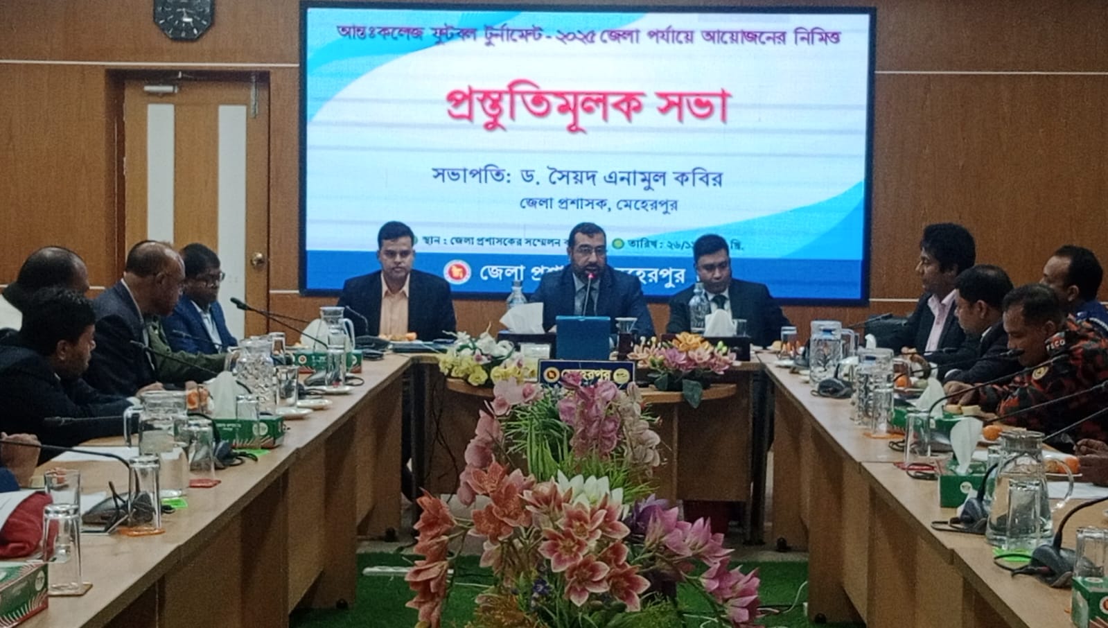 মেহেরপুরে আন্তঃ কলেজ ফুটবল টুর্নামেন্ট সফলভাবে আয়োজনের লক্ষ্যে প্রস্তুতি সভা অনুষ্ঠিত হয়েছে। বুধবার বিকেলে জেলা প্রশাসকের সম্মেলন কক্ষে এই প্রস্তুতি সভা অনুষ্ঠিত হয়।